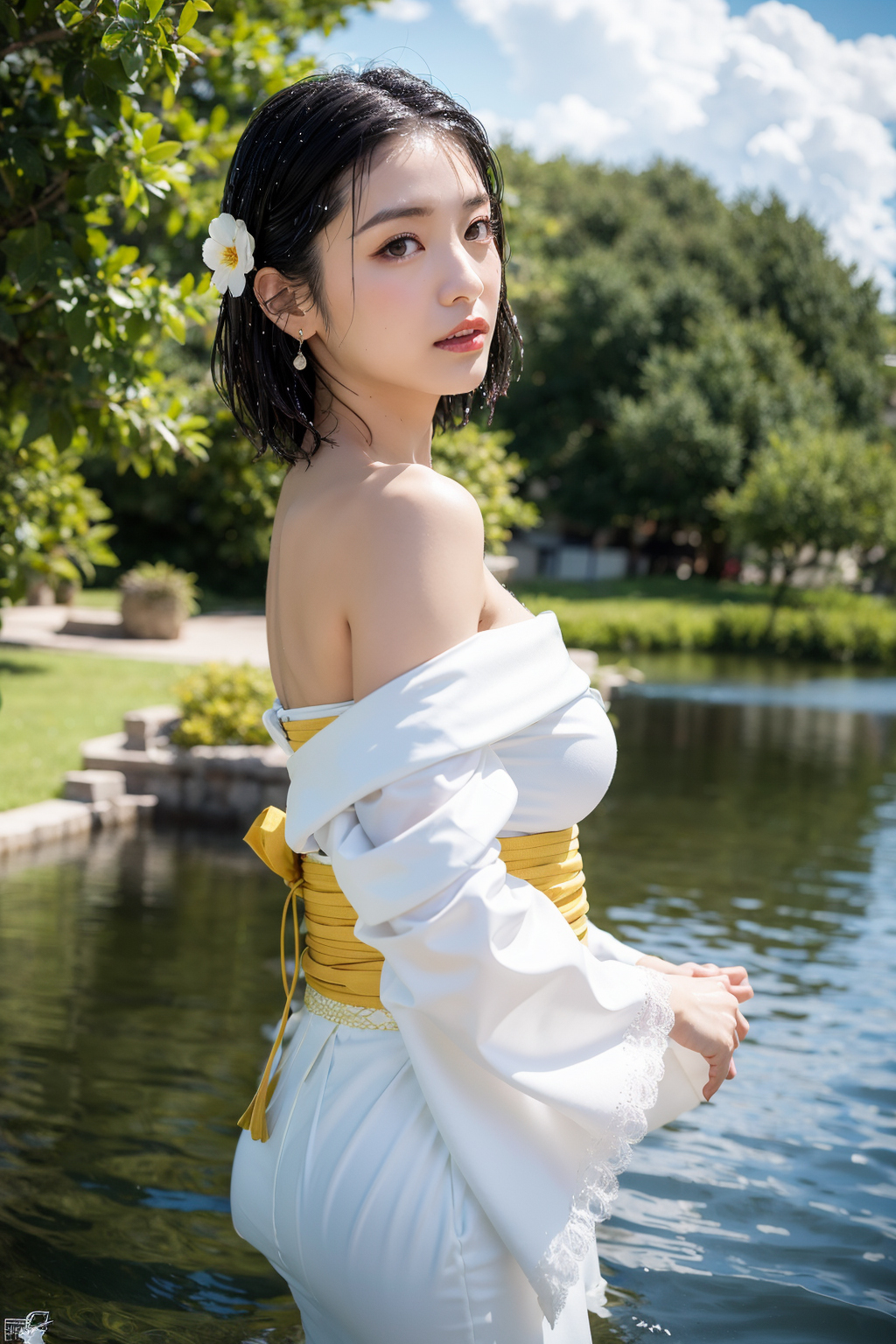 開けた着物、髪が濡れた美女